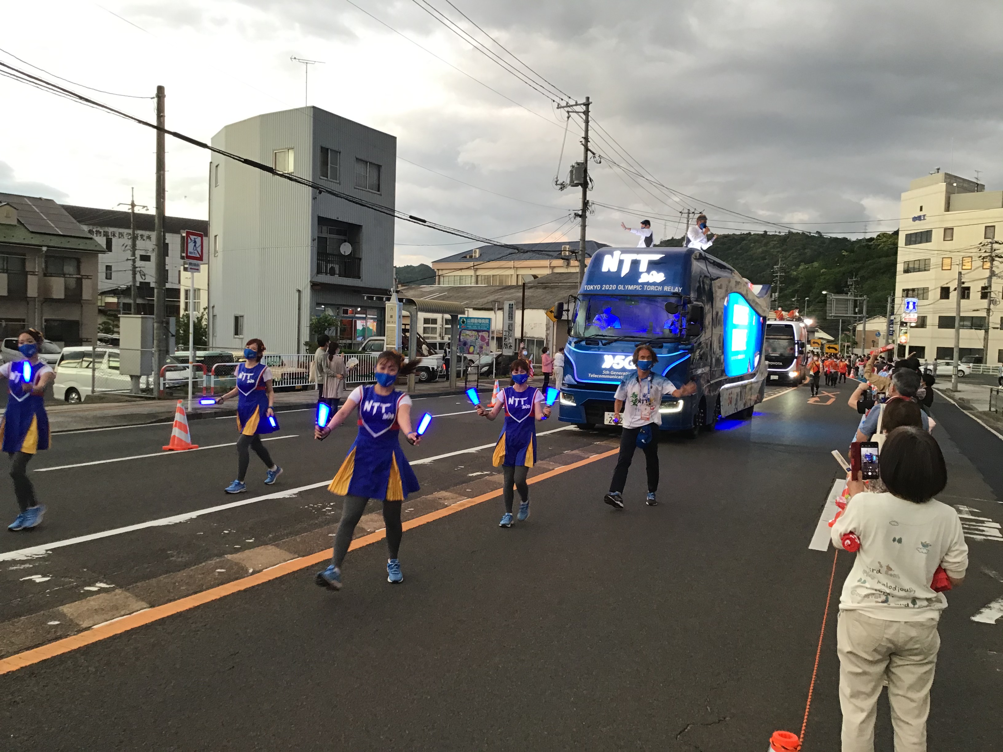 薄暗くなり始めた頃に先頭車両が通過しイベントが始まりました。いきなり聖火を持ったランナーが来るのかと思ったら、目の前を賑やかなサウンドと共に、装飾された車両が次から次へと通って行き、着飾ったサポート隊の方々からは観客に扇子やバッグ、座布団などグッズが配られます。まるでディズニーランドのパレードみたい(行ったことないからイメージです)